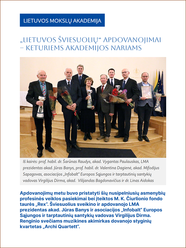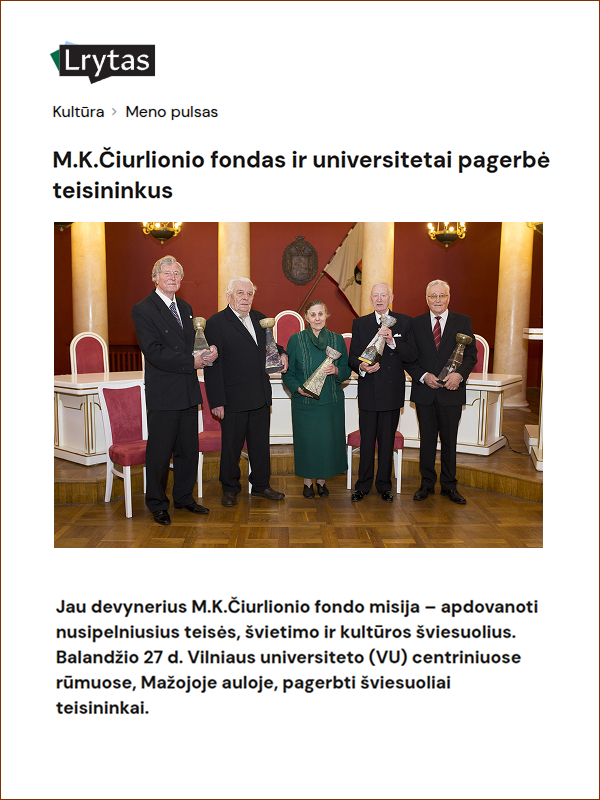 Jau devynerius M.K.Čiurlionio fondo misija – apdovanoti nusipelniusius teisės, švietimo ir kultūros šviesuolius. Balandžio 27 d. Vilniaus universiteto (VU) centriniuose rūmuose, Mažojoje auloje, pagerbti šviesuoliai teisininkai.